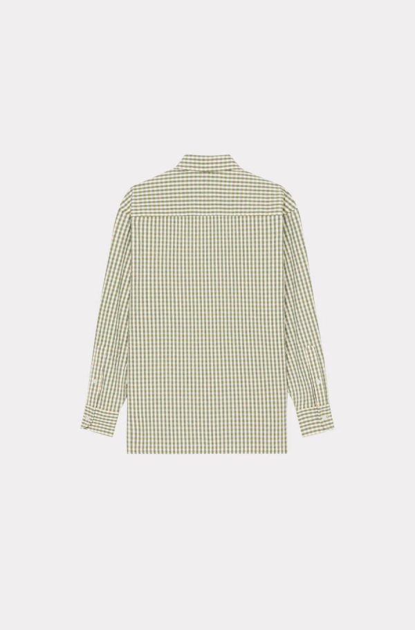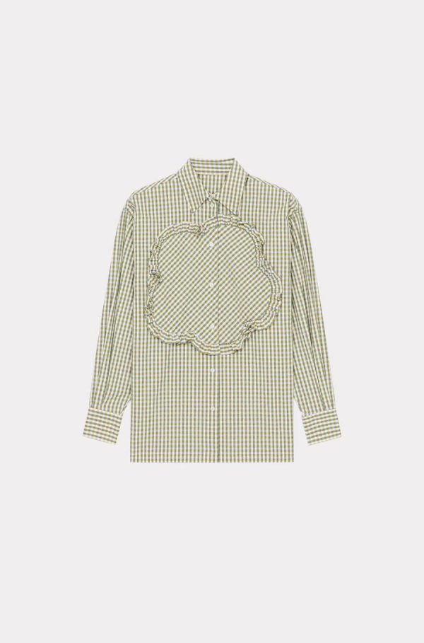 Cette chemise est un hommage du designer Nigo à la mode japonaise des années 80, largement inspirée par les couturiers français. L’empiècement ‘BOKE FLOWER’ à volants, apposé sur un motif Vichy vintage, symbolise ce jeu d’influences.